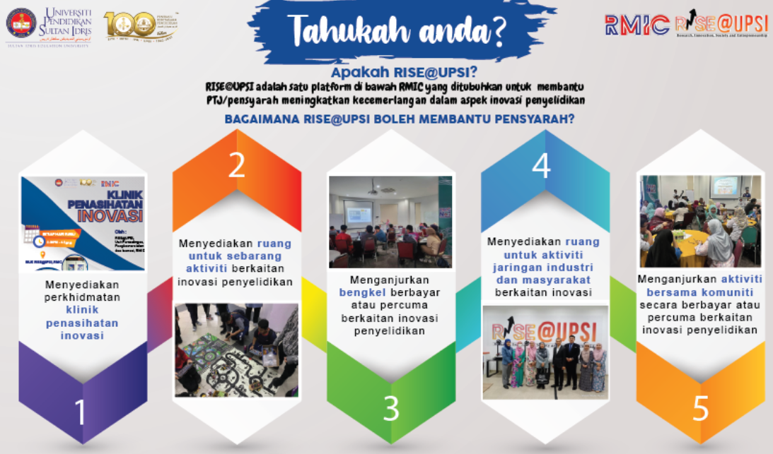 RISE@UPSI ialah sebuah platform di bawah Pusat Pengurusan Penyelidikan dan Inovasi (RMIC) yang menyokong pensyarah dan penyelidik di Universiti Pendidikan Sultan Idris (UPSI) dalam meningkatkan kecemerlangan dalam inovasi penyelidikan, pembangunan produk, dan pengkomersialan.